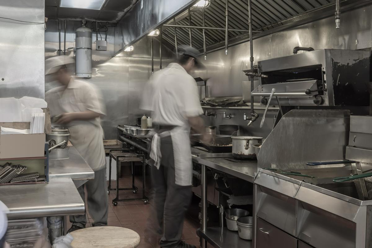 The kitchen layout can make things even more precarious. There could be windowless doors, like the door to the walk-in freezer. A cook could be crouching at a low-boy cooler, out of the line of sight of an approaching colleague. Or they could be coming around a blind corner, arms full of dirty pots and pans.