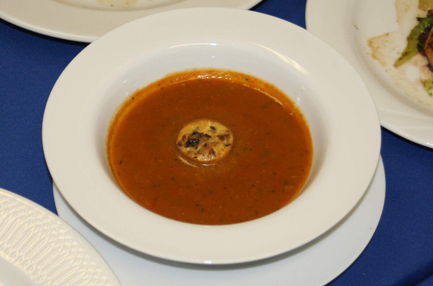 “I actually created this soup by accident while training for a culinary competition. One of my teammates roasted too many vegetables for one of his dishes, so we were going to use the leftover vegetables as lunch. I made Goat Cheese and Mushroom Custards for an appetizer platter and had a few left over while I was thinking about first courses for my Chef of the Year competition. During my practice run, I was given an unclarified chicken consommé to create my soup with. I spent way too much time on my entrée and dessert and had about 10 minutes to get my soup done and plated. I started heating up the consommé and realized that it would take too much time trying to clarify it, so I saw the vegetables, took them and the consommé added them to the Robot Coupe and pureed them into a nice smooth vegetable soup. Realizing I needed another component for the soup and did not have enough time to make crackers, I remembered the custards! I placed a couple of them in a steamer basket, heated them up, and added one to the soup. My practice judges raved about the soup, so I knew that I had to recreate it at the competition. At the competition, my mystery basket included veal stock and from there this final recipe was created. I placed second in the Chef of the Year competition and one of the judges stated that my soup was the best he’s tasted at a competition. I’ve tweaked it over the years trying different vegetables, but I always end up coming back to the original recipe.”