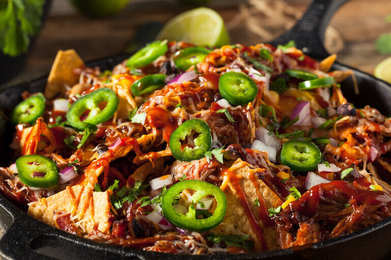 A sports bar or game day favorite, nachos feature tortilla chips covered with melted cheddar cheese sauce (called queso), jalapeno peppers, and an à la carte variety of other toppings, like sliced black olives, tomatoes, guacamole, salsa, or sour cream. Nachos were invented in northern Mexico by Ignacio “Nacho” Anaya in the 1940s and quickly became popular all over Texas.