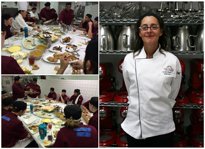 When I walked into the kitchen where Chef Natalie’s Culinary Arts class was working, I saw that each of the students in the class was wearing a piece of blue tape with writing. When I asked Chef Natalie to explain to me what was going on, she let me know that the group was studying food from India that day and she had given them a team building exercise inspired by Gandhi.